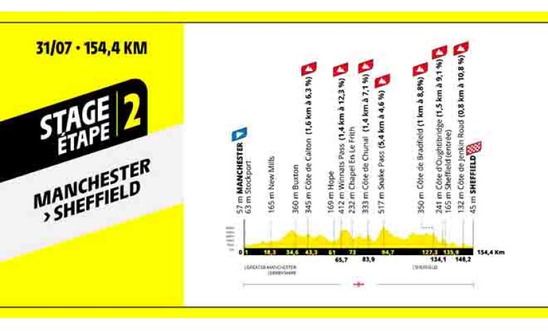 La corsa riprenderà da Manchester per una tappa particolarmente impegnativa attraverso il Derbyshire e il Peak District fino a Sheffield. Dopo Stockport, Marple e New Mills, le prime difficoltà si presenteranno con la salita non classificata di Long Hill prima di Buxton (km 34,6). La tappa presenterà quasi 3.000 metri di dislivello, con salite iconiche come Winnats Pass e Snake Pass. La corsa entrerà a Sheffield attraverso una serie di salite brevi ma impegnative, tra cui Oughtibridge e la famosa Jenkin Road, che fu teatro dell'arrivo del Tour de France 2014. Il traguardo sarà ad Attercliffe Common, dove Vincenzo Nibali vinse nel 2014, ma questa volta in direzione opposta.