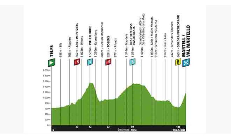 In ottica classifica generale le indicazioni arriveranno proprio nella tappa odierna, che porterà il gruppo dal Tirolo all’Alto Adige, da Telfs a Val Martello per 147,5 km. Si affronta la salita di Pillerhôhe (9 km al 6,2%) in avvio e poi col Passo Resia (16 km al 3,3%) si torna in Italia. La tappa si farà però sulla salita conclusiva, che coi suoi 5 km all’8,9% è destinata a dare il primo verdetto. La scalata terminerà a 1500 metri dall’arrivo di Val Martello: un finale molto selettivo, già decisivo nel 2014 al Giro d’Italia con l’assolo del colombiano Nairo Quintana, che proprio in Val Martello conquistò la sua prima maglia rosa mettendo le basi per il trionfo nella Corsa Rosa.