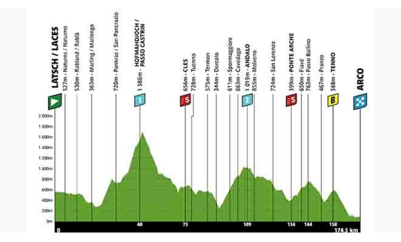 Scatta dal fondovalle della bassa Val Venosta la terza frazione del Tour of the Alps 2026, 175,1 chilometri da Laces, in Alto Adige, ad Arco, in Trentino. Dopo 26 chilometri di pianura, a Lana il profilo altimetrico cambia radicalmente con la lunga ascesa di prima categoria verso il Passo Castrin (22,2 km al 5,7%), il punto più alto di questa edizione, a quota 1.586 metri, e confine naturale tra Alto Adige e Trentino.