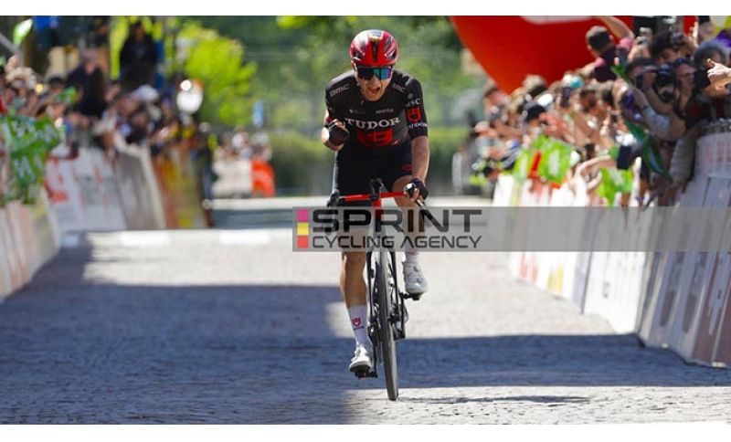 Alle sue spalle Matteo Sobrero (Lidl Trek) e il padrone di casa Federico Iacomoni (Team Ukyo) con Florian Stork, altro corridore della Tudor, che ha regolato il gruppetto dei migliori.