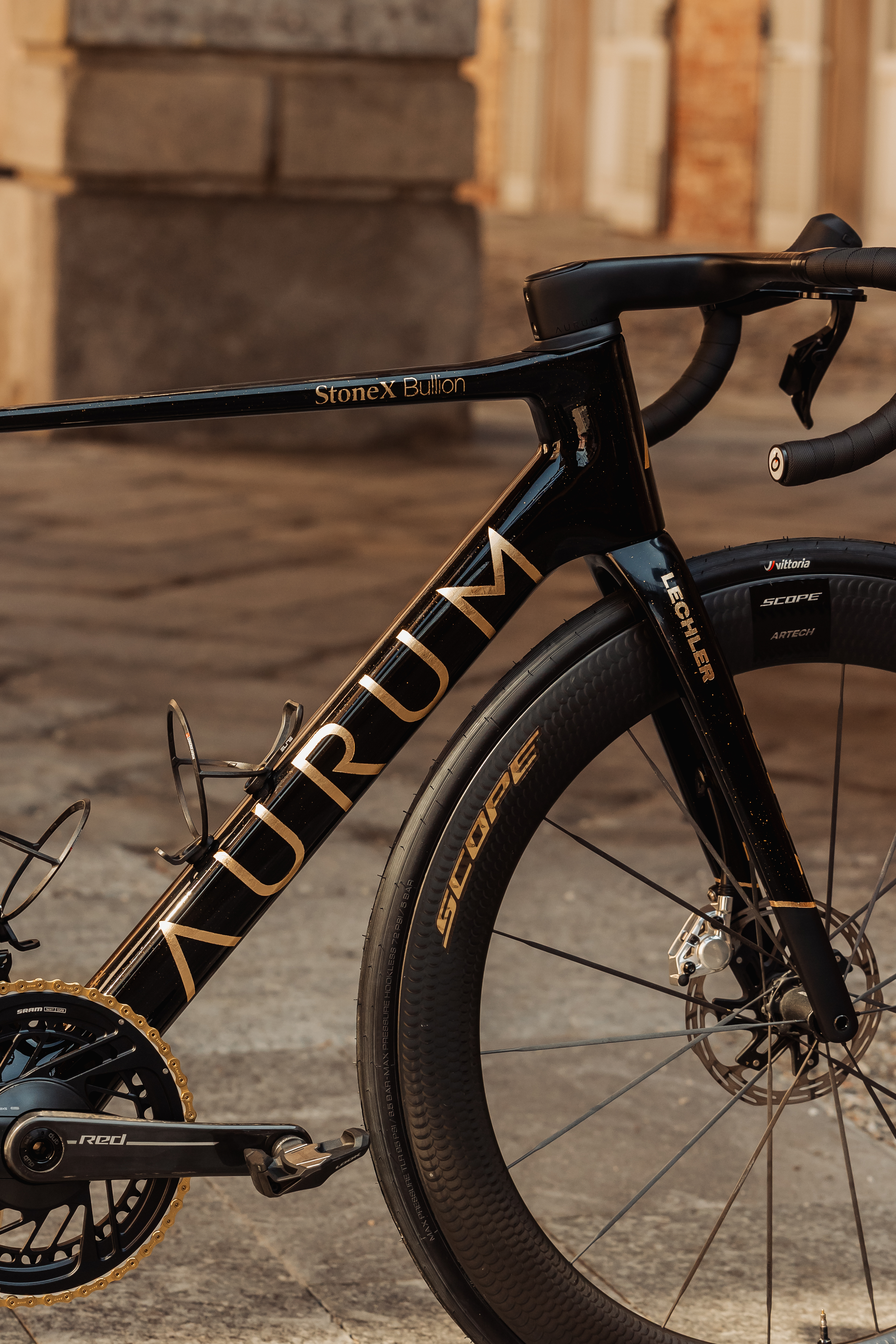 Da un primo dialogo è nata questa collaborazione "quadrangolare" per il Giro: Lechler, organizzatrice dell'evento Alchimia Urbana che ha svelato l'aurea livrea, ha messo tutta la propria sapienza e studio del colore al servizio del tocco d'oro conferito da StoneX al progetto. E quali bici meglio delle Aurum (che in latino vuol dire proprio "oro") per sfoderare quest'abito? Il nome AU109 è di facile intuizione e coerenza: AU come il simbolo chimico dell'oro, 109 come l'edizione del Giro d'Italia.