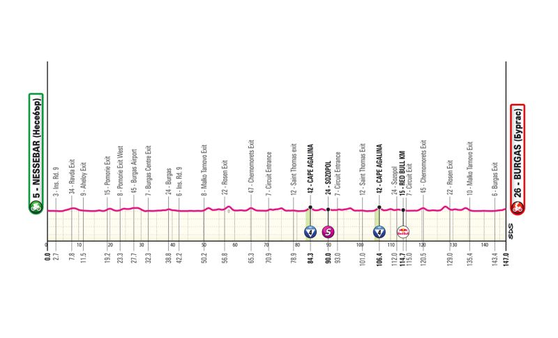 Dal punto di vista altimetrico la tappa non fa paura, anche se nella parte centrale è previsto un circuito di 22 km da ripetere due volte con anche il doppio GPM di 4a categoria di Cape Agalina, utile soprattutto ad assegnare la prima Maglia Azzurra. La zona è comunque esposta al vento, quindi sarà un fattore da valutare prima della tappa. In ogni caso, sembra difficile sfuggire alla prima volata nel centro di Burgas.