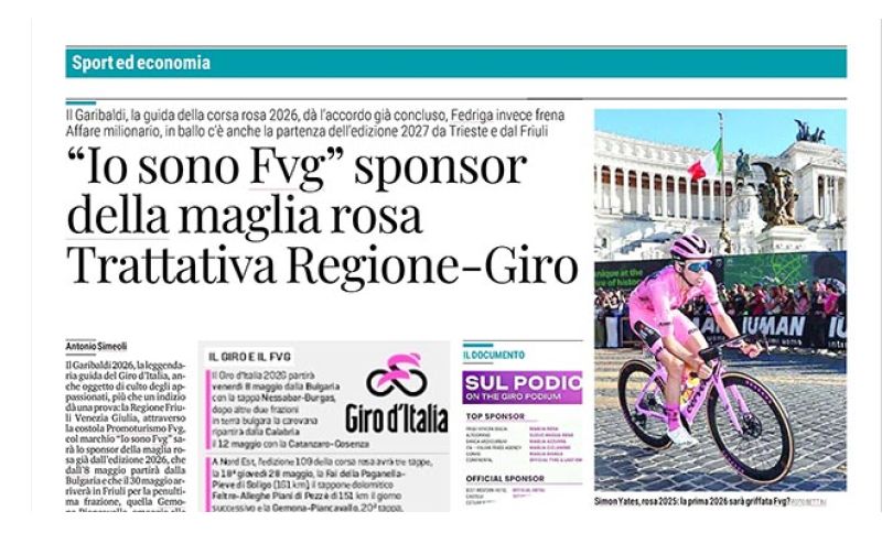 Il Garibaldi 2026, la leggendaria œguida del Giro d’Italia, anche oggetto di culto degli appassionati, più che un indizio dà una prova: la Regione Friuli Venezia Giulia, attraverso la costola Promoturismo Fvg, col marchio “Io sono Fvg” sarà lo sponsor della maglia rosa già dall’edizione 2026, che dall’8 maggio partirà dalla Bulgaria e che il 30 maggio arriverà in Friuli per la penultima frazione, quella Gemona-Piancavallo, omaggio alle