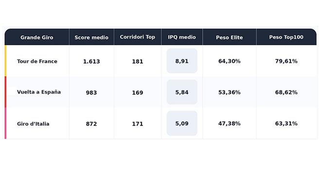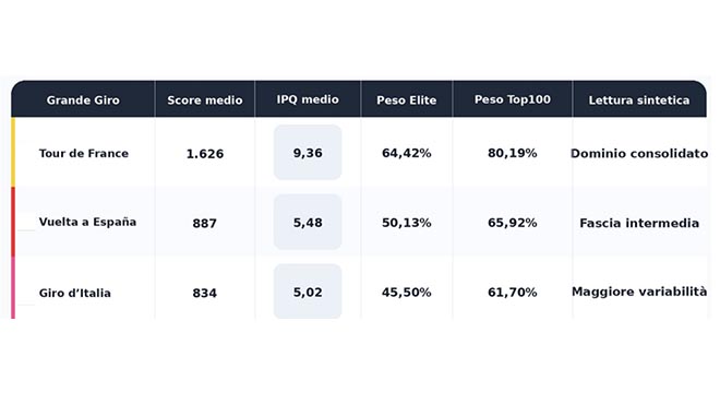 Per questo, accanto allo Startlist Score, è utile osservare anche alcuni indicatori derivati. Il primo è l’IPQ, Indice di Peso Qualitativo della Startlist, ottenuto rapportando lo Score complessivo al numero dei corridori classificati nelle fasce considerate. In altri termini, misura quanta qualità media ponderata esprime ogni corridore presente nella startlist. A questo si aggiungono il Peso Elite, cioè la quota dello Score generata dai corridori Top 10, Top 25 e Top 50, e il Peso Top100, che misura quanto del valore complessivo derivi dai corridori collocati entro la fascia Top 100. La lettura dei dati 2000-2025 relativi a Giro d’Italia, Tour de France e Vuelta a España restituisce una gerarchia molto netta.