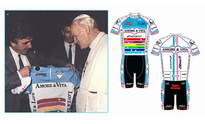 Ritornando al design prosegue: «Il look sarà quindi quello della prima maglia Amore & Vita con i colori azzurro e bianco e la bandiera della pace in primo piano. Il risultato è davvero positivo. Questo style vintage, tra l’altro molto di moda in questi ultimi tempi, risulta elegante ma allo stesso tempo non manca di essere aggressivo. Sono sicuro che a molti appassionati piacerà. Chiaramente c’è stato un leggero restyling, soprattutto nella parte posteriore, dove il colore predominate sarà il bianco ed il logo storico a cuore che creammo proprio sotto il consiglio di Papa Wojtyla. Devo ringraziare Davide Giordani di Leda Sport, da quest’anno nostro nuovo partner e official sponsor per l’abbigliamento tecnico, che l’ha realizzata. Leda Sport è un’azienda seria che veste il ciclismo dal 1970, riponendo la massima attenzione nella ricerca del design più all’avanguardia e dei materiali tecnici più comodi ed innovativi. Sono sicuro che entrambi raccoglieremo molte soddisfazioni da questa collaborazione».