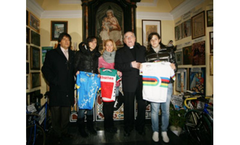 | 04/12/2011 | 13:53 Il Santuario della Madonna del Ghisallo si arricchisce di altre maglie prestigiose: quelle di Maria Giulia Confalonieri (Cicli Fiorin Despar), la milanese che ha vinto il titolo iridato su pista della corsa a punti, della bergamasca Rossella Ratto (Giusfredi Team) bicampionessa europea crono e strada e di Anna Mei detentrice del record mondiale di ciclismo su pista 24 ore non stop. La consegna oggi al presidente del gruppo sportivo Ghisallo Domenico Macrì che al termine di una breve cerimonia, ha ricevuto dalle due giovanissime atlete e dalla 41enne Mei le prestigiose casacche conquistate quest’anno. La giornata era dedicata al Pink Day, organizzato dal gruppo sportivo Madonna del Ghisallo con la collaborazione di Ciclismo In Rosa e del gruppo “Le Cicliste”.