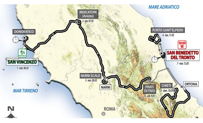 Si parte mercoledì 6 marzo da San Vincenzo con una cronometro a squadre di 16,9 km con arrivo a Donoratico.
