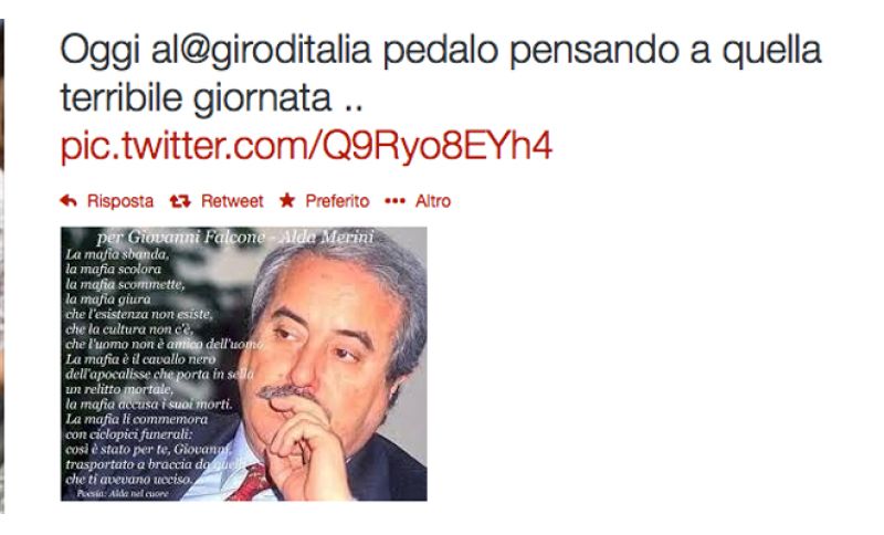 PROFESSIONISTI | 23/05/2014 | 12:03 Era un ragazzo, Paolo Tiralongo, il 23 maggio del 1992. E l'attentato mafioso che si è portato via Giovannio Falcone, la moglie e gli uomini della loro scorta l'ha segnato nel profondo. Ed oggi il siciliano della Astana twitta: «Oggi al@giroditalia pedalo pensando a quella terribile giornata...». Non c'è altro da aggiungere.