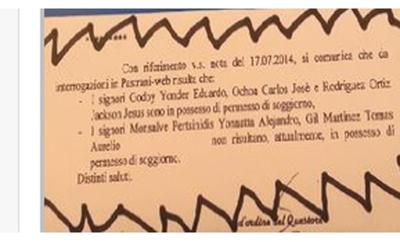 “I signori Godoy Yonder Eduardo, Ochoa Carlos Josè e Rodriguez Ortiz Jackson Jesus sono in possesso di permesso di soggiorno, i signori Monsalve Pertsinidis Alejandro, Gil Martinez Tomas Aurelio non risultano, attualmente, in possesso di permesso di soggiorno”.