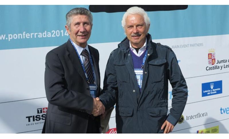 PROFESSIONISTI | 30/09/2014 | 07:14 Ai Mondiali di Ponferrada, con una stretta di mano come si conviene tra galantuomini, Pietro Santini - titolare dell’omonimo maglificio sportivo - e Gianni Savio, Team Manager della Androni Venezuela, hanno rinnovato l’accordo di sponsorizzazione per la prossima stagione.