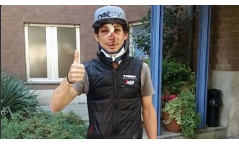 Fabio Felline - è lui, anche se nella foto è davvero irriconoscibile - ci regala su facebook gli aggiornamenti sulla sua condizione: «Ciao a tutti amici e fan, avrei voluto scrivervi per un risultato, un bilancio e invece mi tocca farlo per rassicurarvi sulla mia salute! Questa volta ho preso proprio una bella botta, non è un momento facile ma la mia positività e quella dei medici fanno presagire che in un futuro non troppo lontano possa tornare a pedalare. Si parla di 3 mesi, forse più forse meno, quello che conta è guarire! Sono stato sottoposto ad una risonanza magnetica che conferma la frattura del condilo occipitale (circa 2 mesi di collare) e frattura tripla del setto nasale. A dire il vero anche un dito è rotto ma è passato in secondo piano :):) Voglio dirvi che voglio tornare e ce la metterò tutta per farlo, non chiedetimi quando l'importante è tornare... Un grazie a chi mi sta vicino rendendo la salita meno ripida. Un abbraccio a tutti».