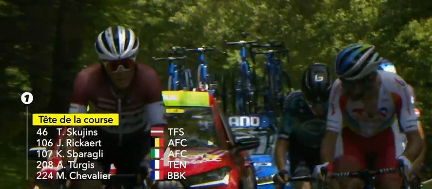 - 45 KM AL TRAGUARDO. Rimangono in tredici al comando: Wout Poels (Bahrain - Victorious), Mattia Cattaneo (Deceuninck Quick Step) Bauke Mollema (Trek - Segafredo), Patrick Konrad (BORA - hansgrohe), Guillaume Martin (Cofidis, Solutions Crédits), Sergio Higuita (EF Education - Nippo),Esteban Chaves (Team BikeExchange), Omar Fraile (Astana - Premier Tech), Louis Meintjes (Intermarché - Wanty - Gobert Matériaux), Valentin Madouas (Groupama - FDJ), Élie Gesbert (Team Arkéa Samsic), Quentin Pacher (B&B Hotels p/b KTM) e Pierre Rolland (B&B Hotels p/b KTM).