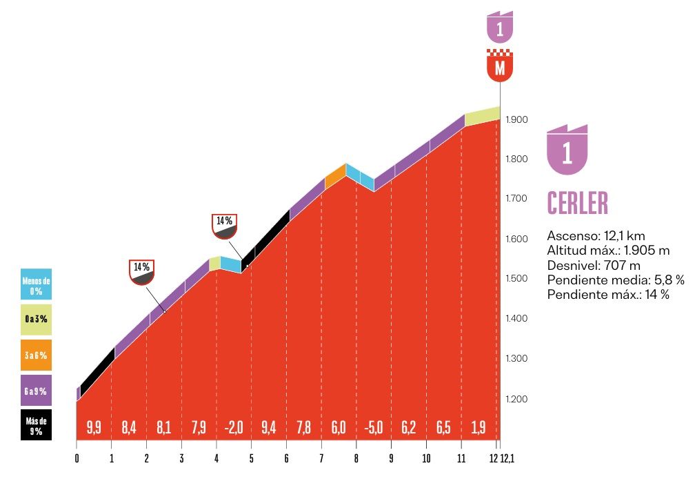 Seconda tappa di montagna consecutiva con 4 salite da affrontare: si parte con il Port del Cantó che misura ben 24,7 km al 4,4% di pendenza media: è un 1a categoria. Seguono poi due ascese di 2a categoria, la Creu de Perves e L'Espina, prima di affrontare l'ascesa finale che misura 12,1 km al 5,8 %, irregolare ma con alcuni tratti piuttosto duri.