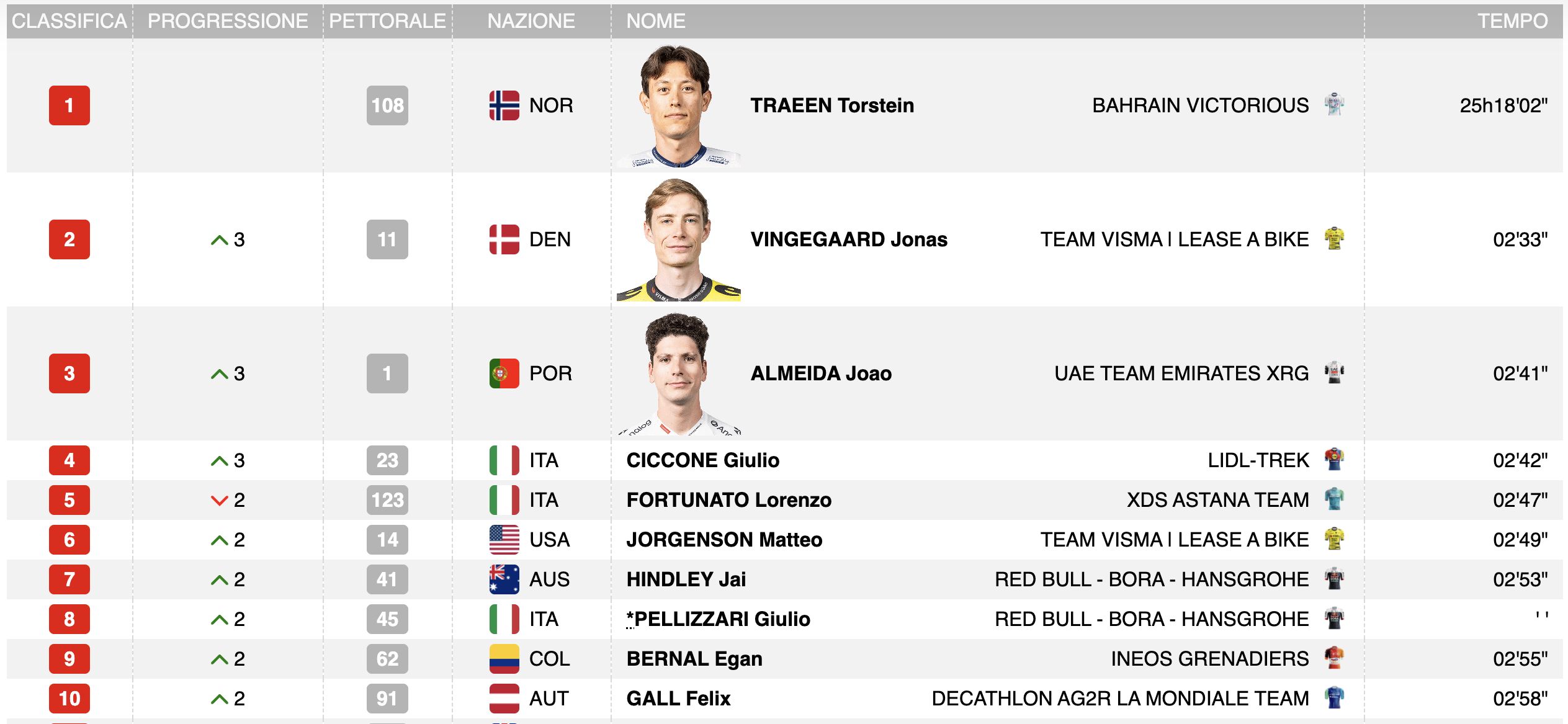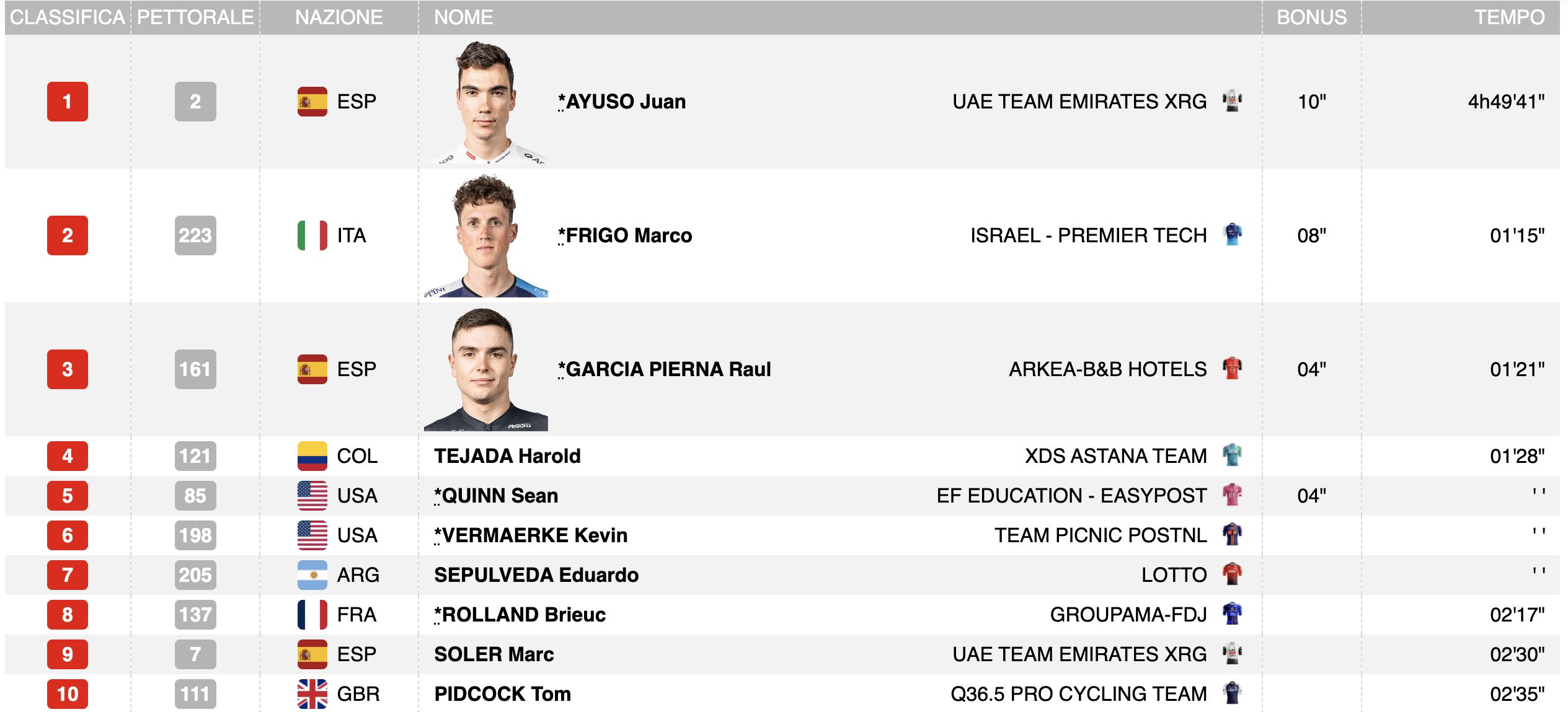 Ieri c'è stata qualche scaramuccia tra i big, ma 11 atleti sono arrivati tutti assieme. C'è stato però un primo verdetto, il crollo del sempre più enigmatico Juan Ayuso, che spalanca così le porte da capitano della UAE Team Emirates-XRG a João Almeida. Non particolarmente brillanti anche Ben O'Connor (Jayco AlUla), Mikel Landa (Soudal-QuickStep) e David Gaudu (Groupama-FDJ), che hanno perso 28" dagli altri favoriti nel finale