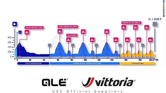Il percorso di questo campionato continentale prevede una prima parte di una cinquantina di chilometri caratterizzata dal Col du Moulin à Vent. Successivamente tre giri con Côte de Saint-Romain-de-Lerps e Côte de Val d'Enfer e un ultimo circuito da ripetere tre volte con Montée de Costebelle e Côte de Val d'Enfer