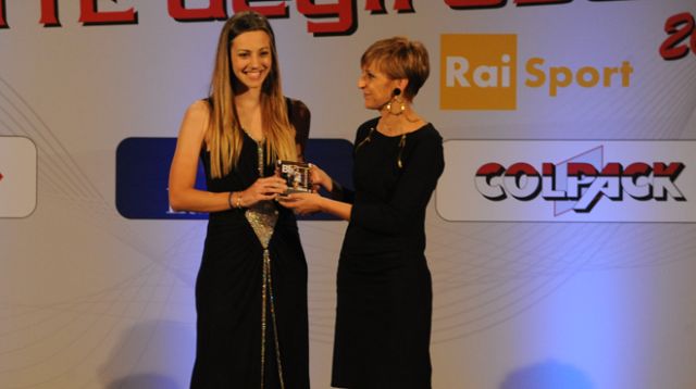 Arianna Fidanza (Eurotarget) è la miglior donna juniores del 2013: a consegnarle l'Oscar tuttoBICI è Mascia Marzorati, titolare di Ambrosio.